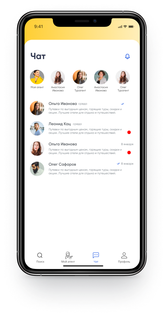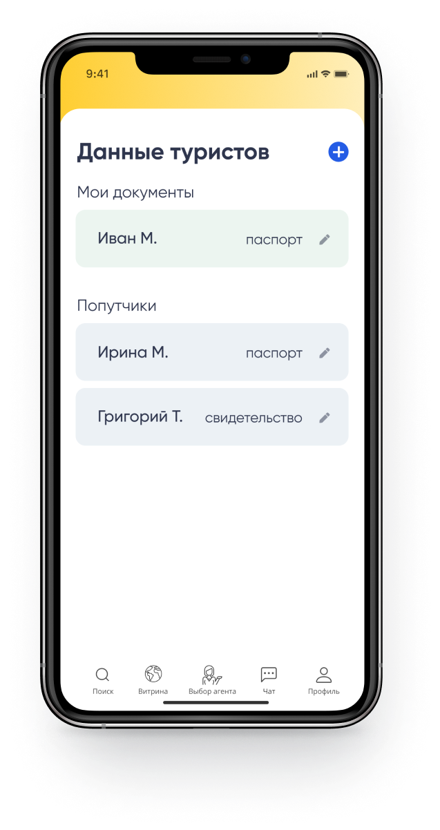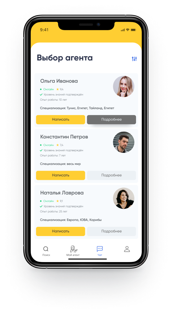 В приложении предусмотрена визуальная возможность выбора туристического агента, проверенного сервисом, по его профилю